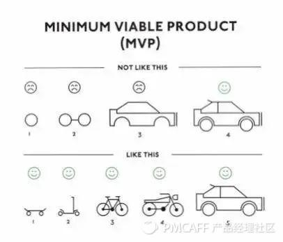 推出一个产品就像造一辆轿车,你无法预测或规划一个最终的形态,然后分解各个零部件的生产任务,最后拼装成一辆轿车。相反,你能做的,是先抽象出轿车的核心功能:将一个人从A地运到B地。然后,利用手头的资源,快速推出一个具备这个核心功能的产品,比如一个滑板。然后基于这个核心功能所形成的用户最小行为闭环,根据获得的反馈不断迭代优化,最终造出一辆轿车,或是一个火箭——谁知道呢。