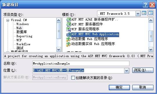 4、 在[新建项目]对话框中,选择[项目类型]为“Visual C#”-“Web”,选择.NET Framework版本为“.NET Framework 3.5”,选择[模板]为“ASP.NET MVC Web Application”,在[位置]文本框中输入你的工作目录如“ E:\ASP.NET MVC\第一章”,在[名称]文本框中输入项目名称如“MvcApplicationExample”。点击[确定]按钮。