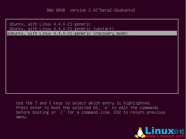 4.选择recovery mode(可能有两个,选择最新的,即最上面出现的)