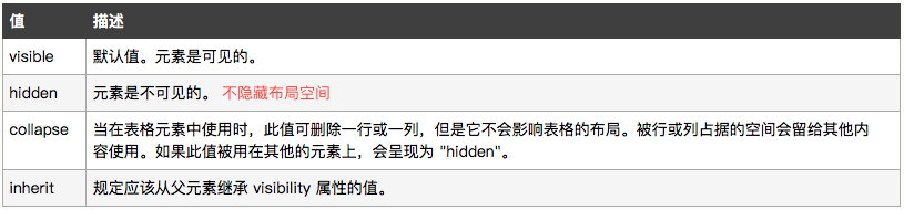 - display:none -- 隐藏元素,包括元素的布局空间也被隐藏