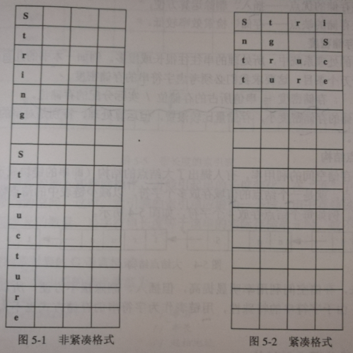 同样存储S=“String Structure”,使用紧凑格式格式一个地址能存四个字符,如图5-2所示。紧凑存储的优点是空间利用率高,缺点是对串中字符处理的效率低。