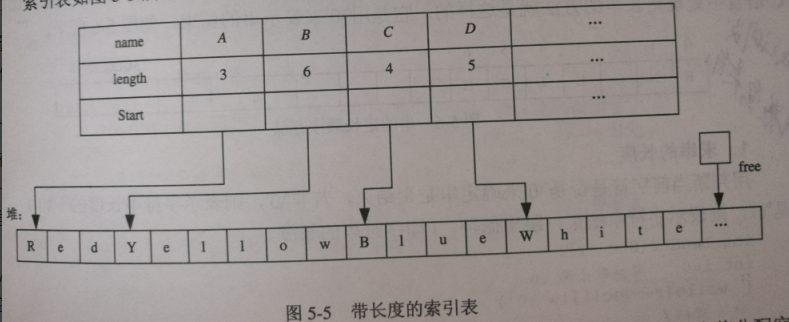 (2)另外建立一个索引表,用来存储串的名称(name),长度(length)和该串在"堆"中存储的起始地址(Start)。