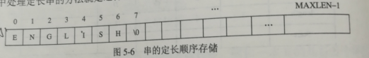 在串尾存储一个不会在串中出现的特殊字符作为串的终结符,以此表示串的结尾。比如C语言中处理定长串的方法就是这样的,它是用‘\0’表示串的结束,如图5-6所示。