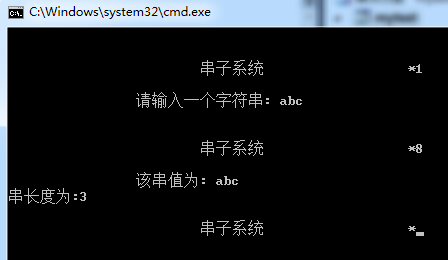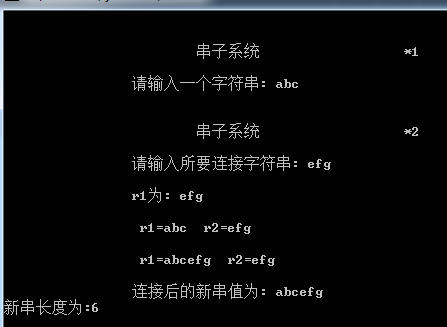 int main() { Str a,b; Str *r=&a,*r1; r->vec[0]='\0'; char choice; int ch=1; while(ch!=0){ printf("\n"); printf("\n\t\t 串子系统 *"); scanf("%c",&choice); getchar(); if(choice=='1'){ printf("\n\t\t请输入一个字符串: "); gets(r->vec);//使用get函数输入字符串 格式为 gets(字符串组名) r->len=LenStr(r); }else if(choice=='2'){ printf("\n\t\t请输入所要连接字符串: "); r1=CreateStr(&b); printf("\n\t\tr1为: "); puts(r1->vec); ConcatStr(r,r1); printf("\n\t\t连接后的新串值为: "); puts(r->vec); int n=LenStr(r); printf("新串长度为:%d",n); } else if(choice=='8'){ ShowStr(r); int n=LenStr(r); printf("串长度为:%d",n); } } return 0; }