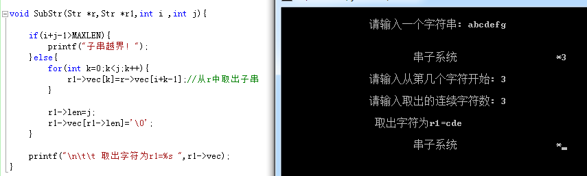 void SubStr(Str *r,Str *r1,int i ,int j){ if(i+j-1>MAXLEN){ printf("子串越界! "); }else{ for(int k=0;k<j;k++){ r1->vec[k]=r->vec[i+k-1];//从r中取出子串 } r1->len=j; r1->vec[r1->len]='\0'; } printf("\n\t\t 取出字符为r1=%s ",r1->vec); }