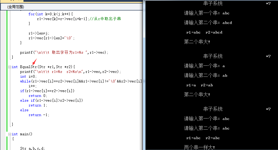 else if(choice=='7'){ printf("\n\t\t请输入第一个串: "); gets(c.vec); printf("\n\t\t请输入第二个串: "); gets(d.vec); int k=EqualStr(&c,&d); if(k>0){ printf("\n\t\t第一个串大! \n"); }else if(k<0){ printf("\n\t\t第二个串大! \n"); }else { printf("\n\t\t两个串一样大! \n"); } }