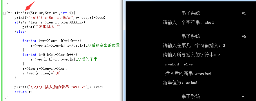 Str *InsStr(Str *r,Str *r1,int i){ printf("\n\t\t r=%s r1=%s\n",r->vec,r1->vec); if(i>r->len||r->len+r1->len>MAXLEN){ printf("不能插入!"); }else{ for(int k=r->len-1;k>=i;k--){ r->vec[r1->len+k]=r->vec[k];//后移空出的位置 } for(int k=0;k<r1->len;k++){ r->vec[i+k]=r1->vec[k];//插入子串 } r->len=r->len+r1->len; r->vec[r->len]='\0'; } printf("\n\t\t 插入后的新串 r=%s \n",r->vec); return r; }