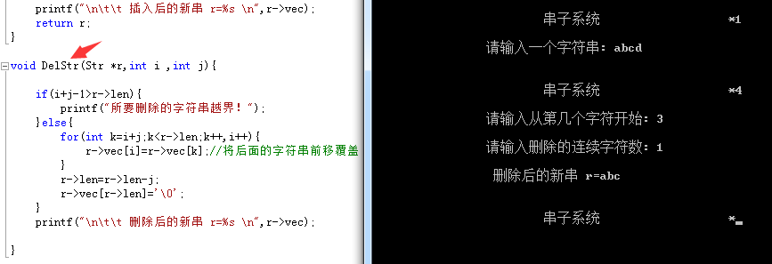 void DelStr(Str *r,int i ,int j){ if(i+j-1>r->len){ printf("所要删除的字符串越界!"); }else{ for(int k=i+j;k<r->len;k++,i++){ r->vec[i]=r->vec[k];//将后面的字符串前移覆盖 } r->len=r->len-j; r->vec[r->len]='\0'; } printf("\n\t\t 删除后的新串 r=%s \n",r->vec); }