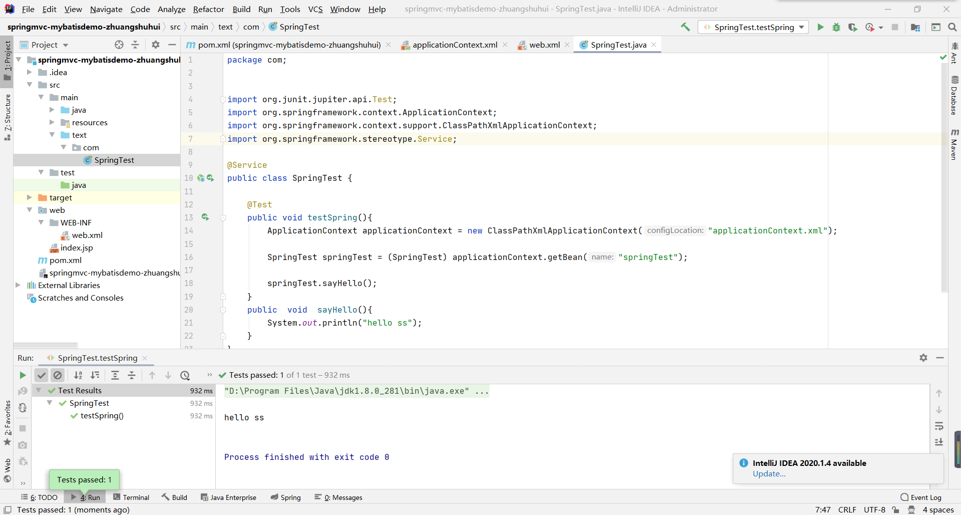 1 package com; 2 3 4 import org.junit.jupiter.api.Test; 5 import org.springframework.context.ApplicationContext; 6 import org.springframework.context.support.ClassPathXmlApplicationContext; 7 import org.springframework.stereotype.Service; 8 9 @Service 10 public class SpringTest { 11 12 @Test 13 public void testSpring(){ 14 ApplicationContext applicationContext = new ClassPathXmlApplicationContext("applicationContext.xml"); 15 16 SpringTest springTest = (SpringTest) applicationContext.getBean("springTest"); 17 18 springTest.sayHello(); 19 } 20 public void sayHello(){ 21 System.out.println("hello ss"); 22 } 23 }