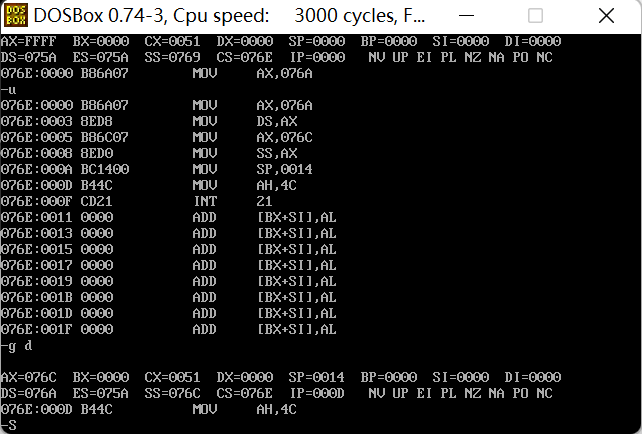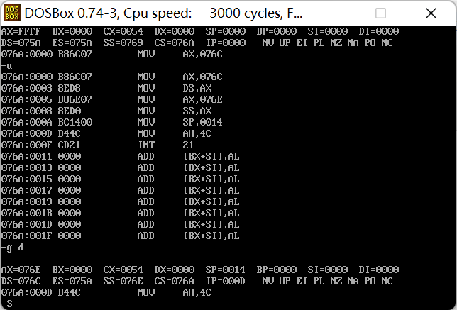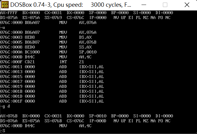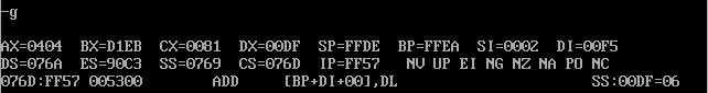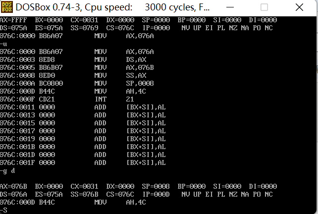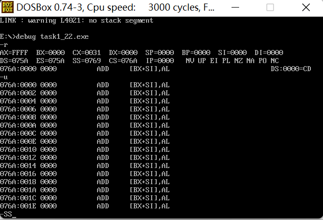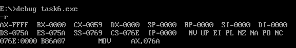 ① 在debug中将执行到line17结束、line19之前,记录此时:寄存器(DS) = 076A, 寄存器(SS) = 076B, 寄存器(CS) =076C