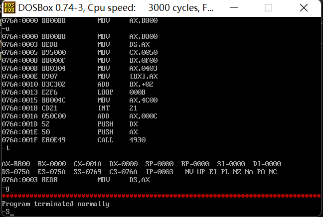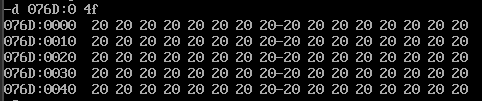 assume cs:codesg codesg segment start:mov ax,0b800h mov ds,ax mov cx,80 mov bx,0f00h s: mov ax,403h mov [bx],ax add bx,2 loop s mov ax,4c00h int 21h codesg ends end