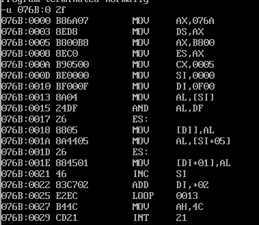 assume cs:code, ds:data data segment db 'Nuist' db 2, 3, 4, 5, 6 data ends code segment start: mov ax, data mov ds, ax mov ax, 0b800H mov es, ax mov cx, 5 mov si, 0 mov di, 0f00h s: mov al, [si] and al, 0dfh mov es:[di], al mov al, [5+si] mov es:[di+1], al inc si add di, 2 loop s mov ah, 4ch int 21h code ends end start