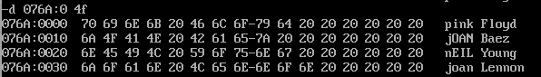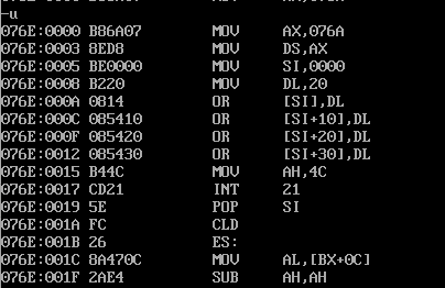 assume cs:code, ds:data data segment db 'Pink Floyd ' db 'JOAN Baez ' db 'NEIL Young ' db 'Joan Lennon ' data ends code segment start:mov ax,data mov ds,ax mov si,0 mov dl,20h or [si],dl or [si+16],dl or [si+32],dl or [si+48],dl mov ah, 4ch int 21h code ends end start