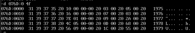 assume cs:code, ds:data, es:table data segment db '1975', '1976', '1977', '1978', '1979' dw 16, 22, 382, 1356, 2390 dw 3, 7, 9, 13, 28 data ends table segment db 5 dup( 16 dup(' ') ) ; table ends code segment start: mov ax,data mov ds,ax mov ax,table mov es,ax mov cx,5 mov bx,0 mov si,0 s: mov ax,[bx] mov es:[si],ax mov ax,[bx+2] mov es:[si+2],ax add si,16 add bx,4 loop s mov bx,20 mov cx,5 mov si,0 mov di,0 s1: mov dx,0 mov es:[di+7],dx mov ax,[bx+si] mov es:[di+5],ax div word ptr [bx+10+si] mov es:[di+13],ax mov ax,[bx+10+si] mov es:[di+10],ax add di,16 add si,2 loop s1 mov ah, 4ch int 21h code ends end start