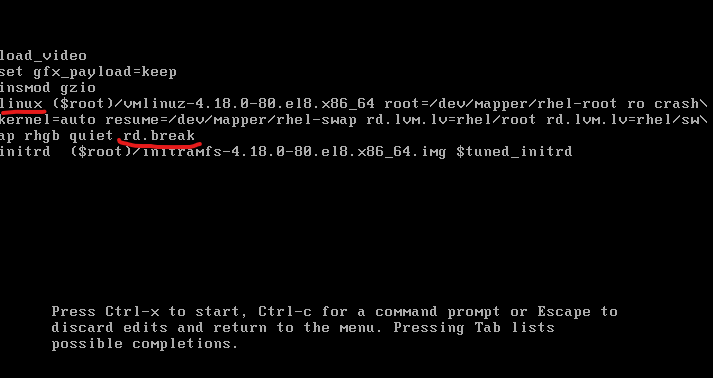 在linux参数这行的最后面追加“rd.break”参数,然后按下“Ctrl + x”组合键来运行修改过的内核程序,如下图