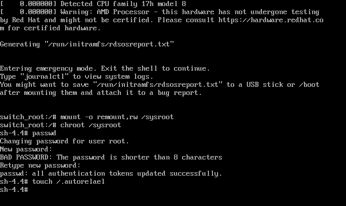 touch /.autorelabel #设置密码后,在重新启动时启用SELinux重新标记并退出控制台