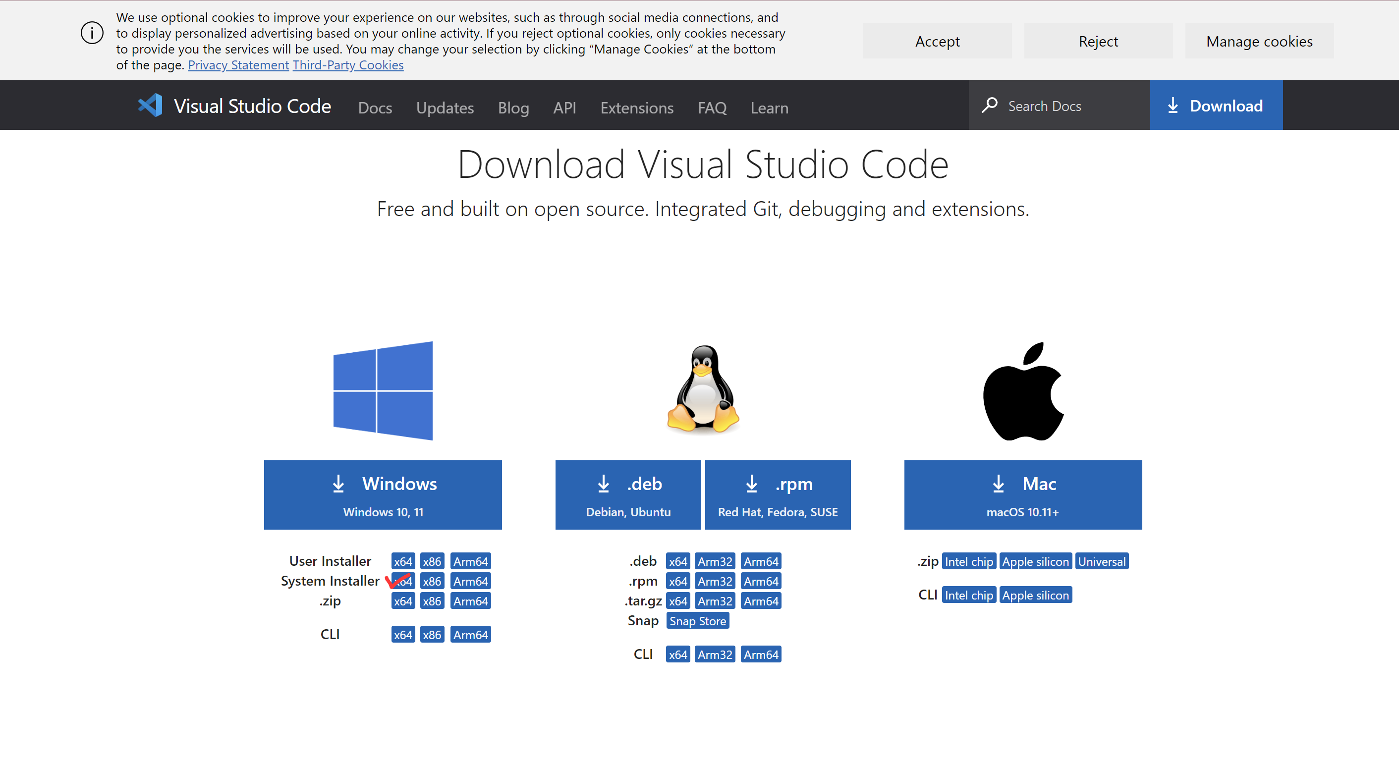 1.vscode官网下载vscode(system版方便设置存储位置,权限齐全)