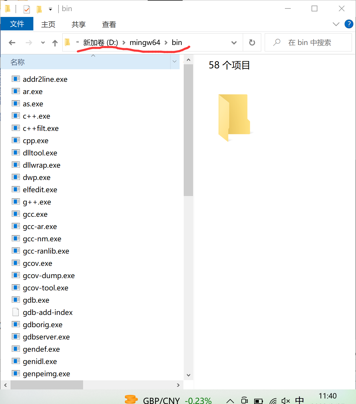 把下载后的文件(mingw64)打开,可以看到bin文件夹,把这个地址复制下来(下载时最好搞全英文路径)