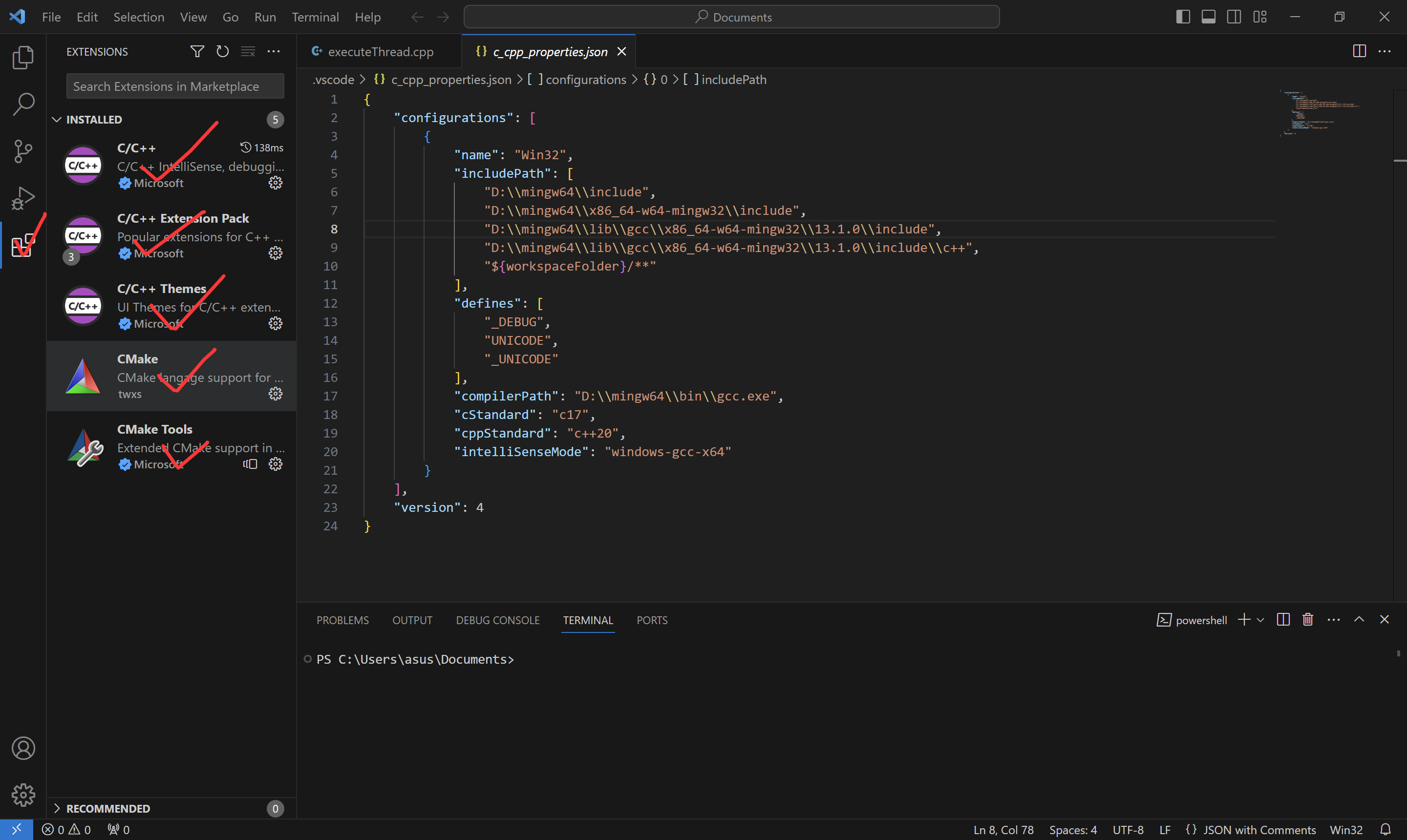 { "configurations": [ { "name": "Win32", "includePath": [ "D:\\mingw64\\include", "D:\\mingw64\\x86_64-w64-mingw32\\include", "D:\\mingw64\\lib\\gcc\\x86_64-w64-mingw32\\13.1.0\\include", "D:\\mingw64\\lib\\gcc\\x86_64-w64-mingw32\\13.1.0\\include\\c++", "${workspaceFolder}/**" ], "defines": [ "_DEBUG", "UNICODE", "_UNICODE" ], "compilerPath": "D:\\mingw64\\bin\\gcc.exe", "cStandard": "c17", "cppStandard": "c++20", "intelliSenseMode": "windows-gcc-x64" } ], "version": 4 }