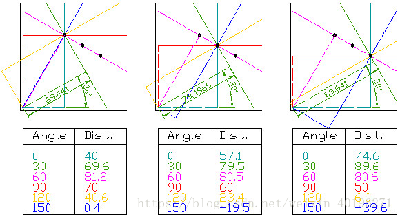 这个例子中,对于每个点均求过该点的6条直线的(r,theta)坐标,共求了3*6个(r,theta)坐标。可以发现在theta=60时,三个点的r都近似为80.7,由此可判定这三个点都在直线(80.7,60)上。