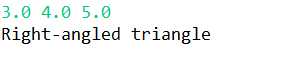 1 import java.util.Scanner; 2 3 public class Main { 4 5 public static void main(String[] args) { 6 double a,b,c; 7 Scanner input = new Scanner(System.in); 8 a = input.nextDouble(); 9 b = input.nextDouble(); 10 c = input.nextDouble(); 11 if(a<1||b<1||c<1||a>200||b>200||c>200) { 12 System.out.println("Wrong Format"); 13 } 14 else if(a+b<=c||a+c<=b||b+c<=a) { 15 System.out.println("Not a triangle"); 16 } 17 else if(a==b&&b==c) { 18 System.out.println("Equilateral triangle"); 19 } 20 else if(a==b||b==c||a==c) { 21 System.out.print("Isosceles "); 22 if((a*a+b*b)-(c*c)<1e-10||(a*a+c*c)-(b*b)<1e-10||(b*b+c*c)-(a*a)<1e-10) { 23 System.out.println("right-angled triangle"); 24 } 25 else { 26 System.out.println("triangle"); 27 } 28 } 29 else if((a*a+b*b)-(c*c)<1e-10||(a*a+c*c)-(b*b)<1e-10||(b*b+c*c)-(a*a)<1e-10) { 30 System.out.println("Right-angled triangle"); 31 } 32 else { 33 System.out.println("General triangle"); 34 } 35 } 36 }