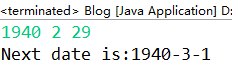 1 public static void nextDate(int year, int month, int day) { 2 monthDay[0] = monthDay[2] = monthDay[4] = monthDay[6] = monthDay[7] = monthDay[9] = monthDay[11] = 31; 3 monthDay[3] = monthDay[5] = monthDay[8] = monthDay[10] = 30; 4 monthDay[1] = 28; 5 if(isLeapYear(year)) { 6 monthDay[1] += 1; 7 } 8 int nextYear = 0; 9 int nextMonth = 0; 10 int nextDay = 0; 11 if(day == monthDay[month - 1]) { 12 if(month == 12) { 13 nextYear = year + 1; 14 nextMonth = 1; 15 nextDay = 1; 16 } 17 else { 18 nextYear = year; 19 nextMonth = month + 1; 20 nextDay = 1; 21 } 22 } 23 else { 24 nextYear = year; 25 nextMonth = month; 26 nextDay = day + 1; 27 } 28 System.out.println("Next date is:" + nextYear + "-" + nextMonth + "-" + nextDay); 29 }