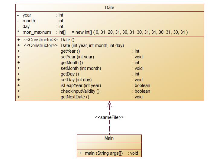 题目要求各属性都必须私有,所以要想得到其中年月日信息,就需要相应方法将其返回,故设计getYear等方法返回其值。由输入得到日期需要另设计方法setYear等,将参数的值赋给其对应私有属性。其他方法入isLeapYear、checkInputValidity、nextDate都与之前的相似,主要差别在于它放在Date类中,与各属性同步,需要使用则需调用类。