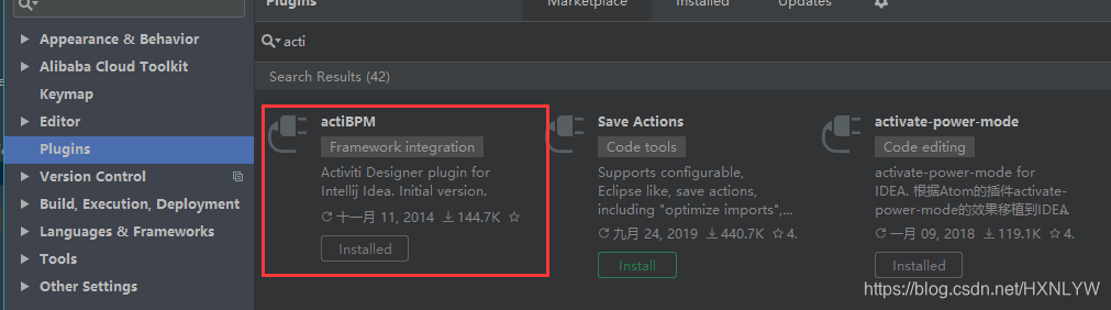 首先安装下可视化插件,我的用是Idea开发,在插件中心安装actiBPM插件: