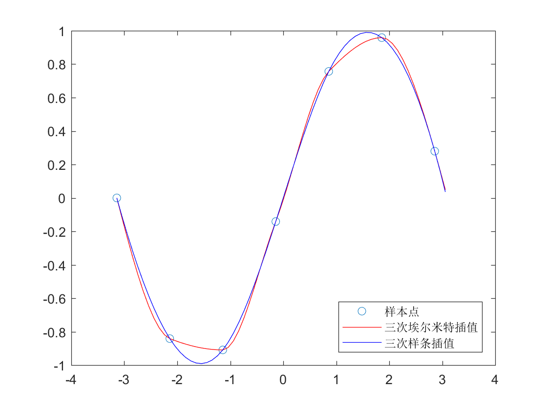 %x是已知的样本点的横坐标;y是已知的样本点的纵坐标;new_x是要插入处对应的横坐标 figure(2); plot(x,y,'o',new_x,p1,'r-',new_x,p2,'b-') legend('样本点','三次埃尔米特插值','三次样条插值','Location','SouthEast') %标注显示在东南方向