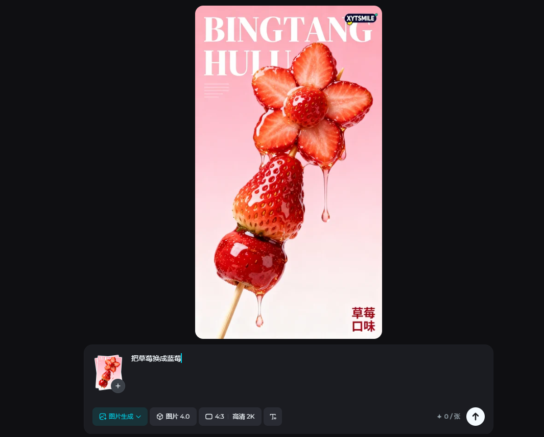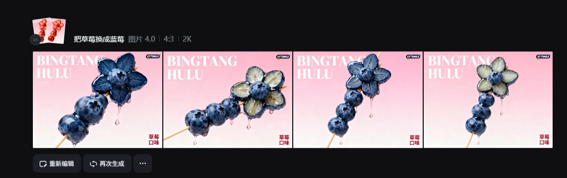 “把顶部草莓替换成蓝莓,保持光影一致。”