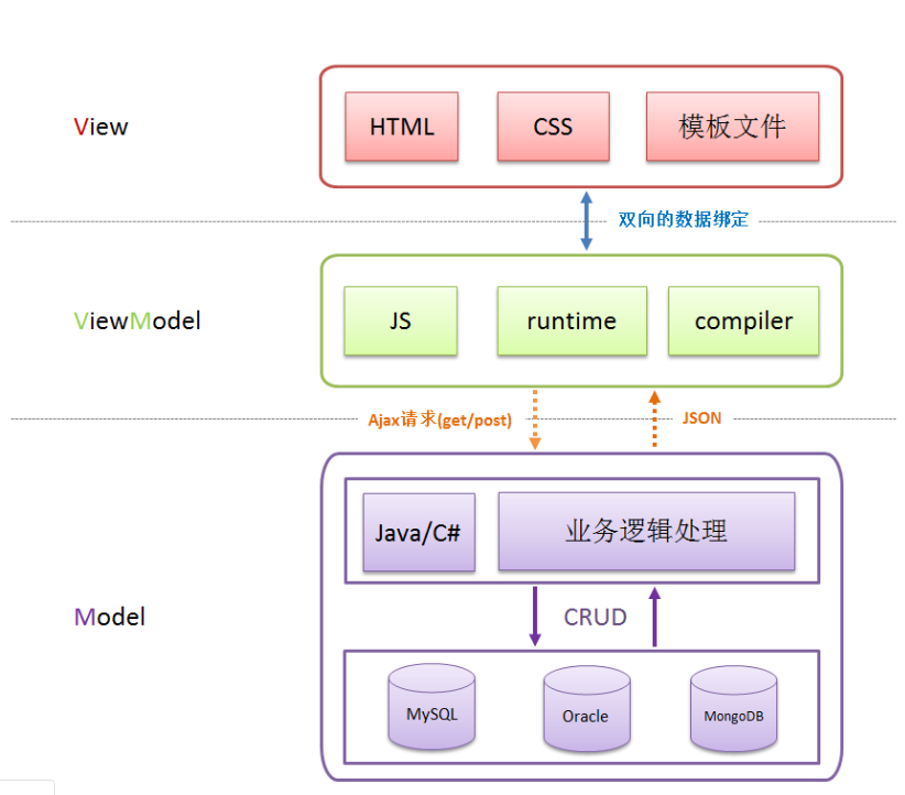 MVVM 的核心是 ViewModel 层,它就像是一个中转站(value converter),负责转换 Model 中的数据对象来让数据变得更容易管理和使用,该层向上与视图层进行双向数据绑定,向下与 Model 层通过接口请求进行数据交互,起呈上启下作用。