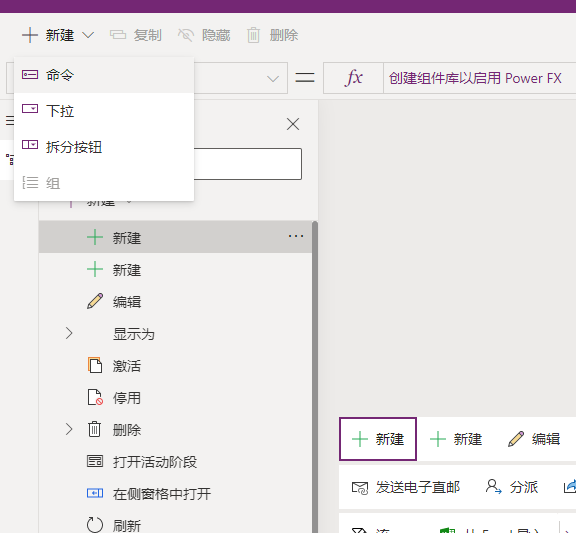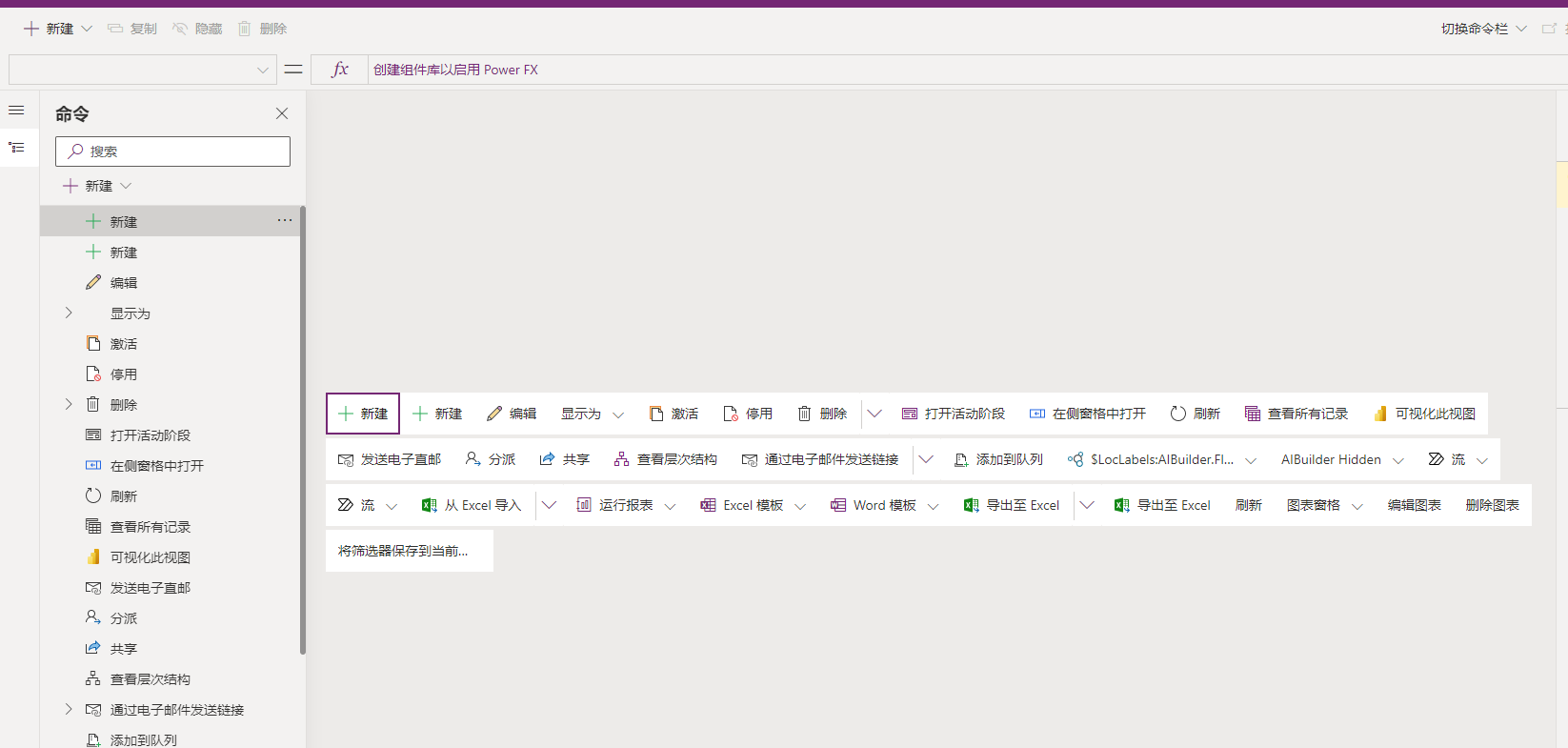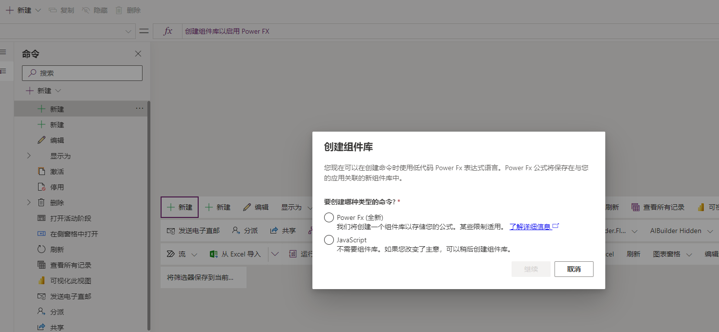 命令栏添加的自定义按钮,点击之后的执行逻辑,有两种实现方式,一种是传统的Javascript脚本,另一个种是Power fx语言,要使用Power FX语言,需要提前创建组件库