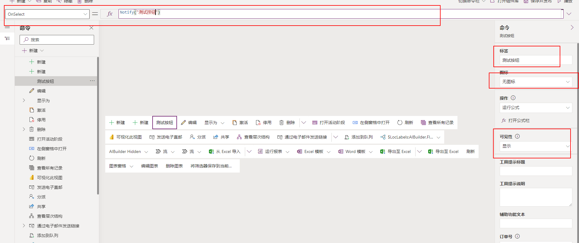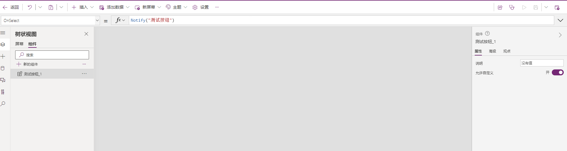 这里以Power FX为例,选择创建组件库,添加按钮后,可以在左侧属性栏,更改按钮的标签、图标以及可见性,在顶部公式栏可以添加按钮的OnSelect事件,与Canvas App一样,都是通过Power FX语法编写
