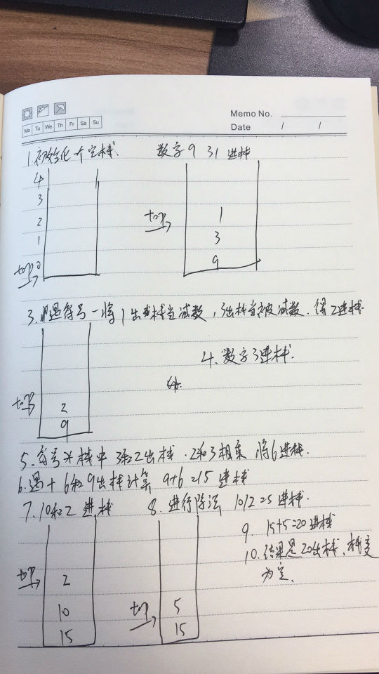 加减乘除比如 9+(3-1)*3+10/2 对计算机来说困难在于乘除在加减的后面要先运算还有括号要处理 用栈结构正好处理,只要碰到左括号就进栈,后面出现右括号就出栈,期间让数字运算。但先乘除再加减的问题依然复杂