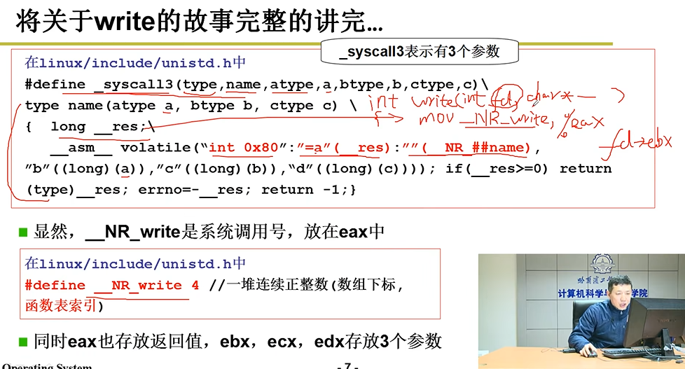 __asm__这块是内嵌汇编,"=a"(__res)表示将eax中的返回值赋给__res,后面""里面是空的,表示和前面一样指的是eax,即把__NR_##name表示的系统调用号赋给eax作为参数(宏展开后就是__NR_##write),后面就是把参数a b c赋给ebx ecx edx,参数都赋好后,int 0x80执行进入内核...
