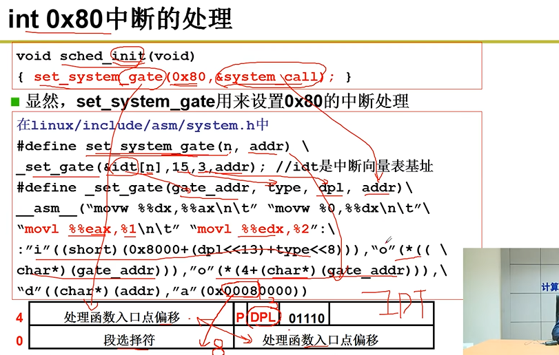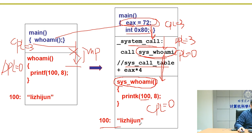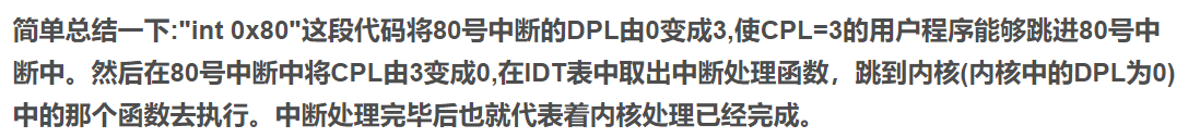 - int指令将使CS中的CPL改为0,“进入内核”。这是用户程序发起的调用内核代码的唯一方式;