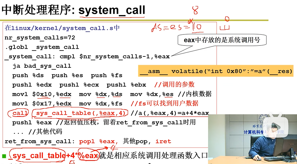 硬件提供了“主动进入内核的方法”:对于Intel x86,那就是中断指令int(int 0x80)
