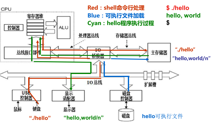 - shell程序将用户从键盘上输入的每个字符逐一读入CPU寄存器中,然后再保存到主存储器中,在主存的缓存区形成字符串“./hello”(对应红线)。