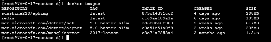 输入 docker images 查看是否多了 sunshine223/apkimg这个镜像