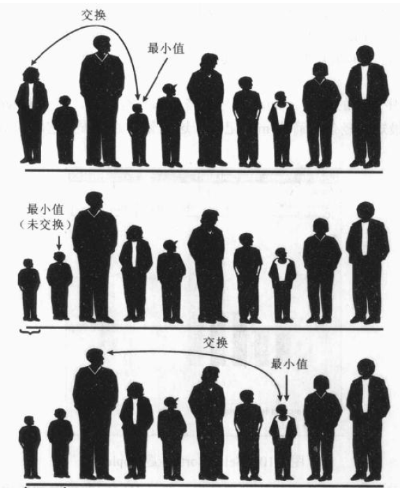 选择排序就是把所有队员都扫描一遍,从中挑出(或者是选择出,这就是选择排序名字的由来)最矮的一个队员。最矮的这个队员和站在队列最左边即0号位置的队员交换位置,现在最左端的球员是有序的了,不需要再交换位置了。 注意,这个算法中 有序的队员都是站在队列最左边(下标较小的位置),而冒泡排序有序的队员则是站在队列最右边。 再次扫描球队队列时就把最矮的球员和1号位置球员交换,重复这个过程,直到所有队员都已排好序。