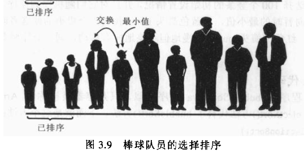 让我们再来考虑棒球队员排序的问题。在选择排序中不再只比较两个相邻的球员,因此需要记录下某一个指定球员的高度;可以用记事本写下指定球员的身高,同时还需要准备一条红色的毛巾。