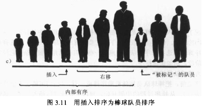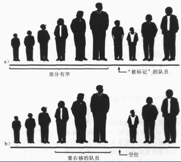 这个移动过程什么时候结束呢?假设你和被标记的球员一起向球队的左侧移动,在每个位置上,队员都向右移动一位,同时被标记的球员和下一个要移动的球员比较身高。当把最后一个比标记队员还高的队员移动之后,这个移动过程就停止了。最后一次移位后空出来的位置就是这个被标记球员应该插入的位置。这个步骤如图3.11.c