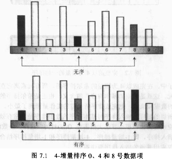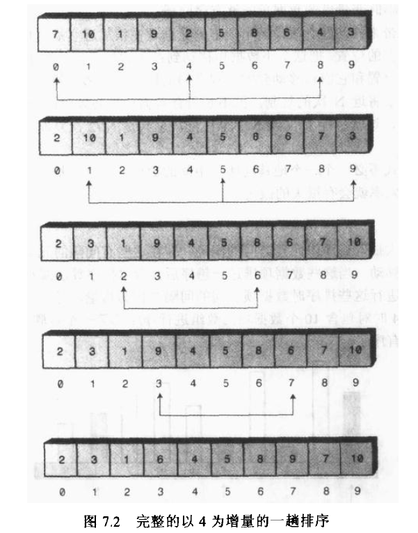 当对0,4,8号数据项完成排序之后,算法向右移动一位,对1,5,9位置排序。这个排序过程持续进行,直到所有的数据项都已完成了4增量排序。 也就是说所有间隔为4的数据项都已经有序了。这个过程如图7.2所示。