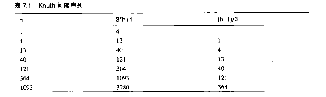举个例子来说,比如有1000个数据项,可能先以364为增量,然后以121为增量,然后40为增量,然后以13为增量,然后4为增量,然后1为增量。 用来形成间隔的数列(在本例中为364,121,40,13,4,1)被称为间隔数列。这里所表示的间隔数列由Knuth提出,此数列是很常用的。数列以逆向形式从1开始,通过递归表达式h=3*h+1 产生。 初始值为1。 表7.1的前两栏显示了这个公式的产生序列。