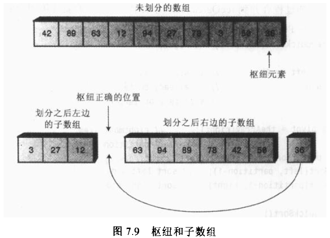 . 可以选择任意一个数据项作为枢纽。为了简单,我们假设总是选择待划分的子数组的最右端的数据作为枢纽。