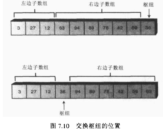 因为不能跟图一样把一个数组分开,所以这个图只是一个想象的情况,那怎么才能把枢纽移动到正确位置上来呢? 可以把右边子数组的所有数据项往右边移动一位,以腾出枢纽位置。但是这么做既低效又不必要。记住尽管右边子数组的数据项都大于枢纽, 但他们都还没有排序,所以他们可以在右边子数组内移动而没有影响。因此,为了简化枢纽插入正确位置的操作,只要交换右边子数组最左端的数据项(目前是63)和枢纽就可以了.。这个交换操作把枢纽放在了它正确的位置上,63调到了最右端,但是它仍然在比枢纽大的右端的子数组内,所以划分并没哟被打乱。如图7.10所示