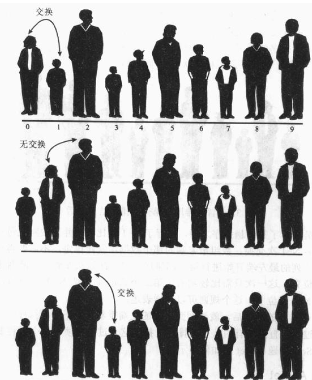 此时在队伍中间有一个做为标记的队员(可以把一条红色的运动衫扔到这个队员前面)。在这个标记的运动员左边已经局部有序了,然而这些运动员在队伍的最终位置还没有确定,因为当没有排过顺序的运动员插入到他们中间的时候,他们的位置还要变动。 注意:局部有序再冒泡和选择排序中是不会出现的,因为在这两个算法中一组数据在某个时刻是完全有序的;在插入排序中一组数据仅仅是局部有序。