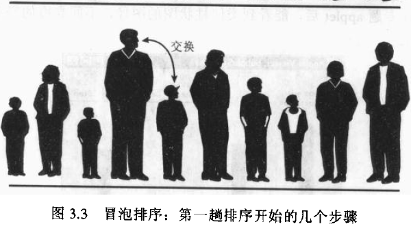 冒泡排序过程如下: 假设有N个队员,并且从左往右对这N个队员编上号 0到 N-1 。 从队伍的最左边开始,比较第0个位置和第1个位置的队员的身高,如果0号位置队员身高大于1号位置队员身高,那么交换0号位置和1号位置的队员,如果0号位置队员身高小于1号位置队员的身高,那么什么也不做。然后右移一个位置,比较1号位置队员和2号位置队员的身高,和刚才一样如果左边队员身高高则交换两个队员的位置。这个排序过程如图3.3所示。
