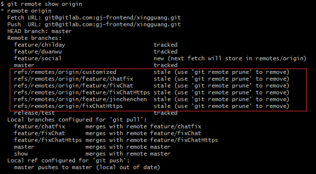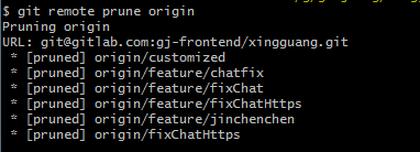 可以发现红框中的分支是远程分支已被删除的分支,根据提示可以使用 git remote prune 来同步删除这些分支。