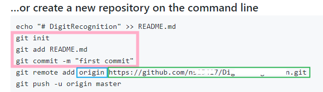 在这时执行git remote add 命令,就是将本地仓库与远程仓库建立连接, git remote add命令中,add什么呢?蓝色的方框其实就是为远程仓库命名,一般都是叫origin,其实可以叫其他的名字,绿色方框就是你远程仓库的真实地址。